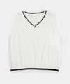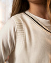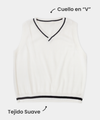 Este chaleco combina elegancia y estilo en una prenda versátil y encantadora. Su tono marfil con franjas negras en cuello, sisa y fajón crea un contraste moderno y delicado. Perfecto para usar sobre blusas o camisas, aporta un toque sofisticado a cualquier look.
