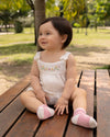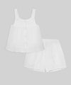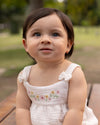 Un conjunto lleno de delicadeza y encanto, perfecto para acompañar sus primeros momentos especiales. Con detalles bordados, recogidos suaves y acabados femeninos, esta propuesta combina frescura y comodidad en cada movimiento.