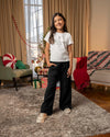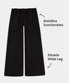 Un diseño moderno y cómodo que combina elegancia con libertad de movimiento. Este pantalón tipo wide leg destaca por su caída fluida y su pretina elástica, ideal para acompañar diferentes estilos del día a día o momentos especiales. Su confección en tono negro le da un aire sofisticado sin perder el toque juvenil.